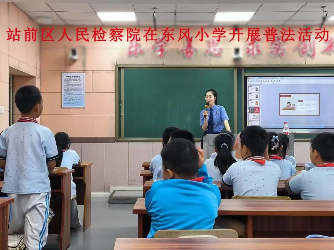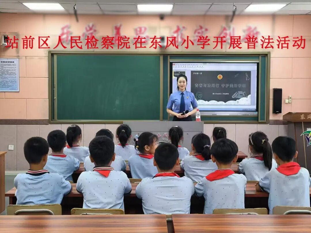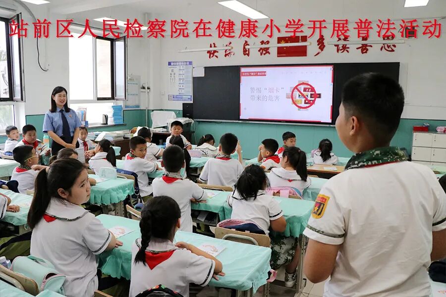 为保障未成年人健康成长,筑牢未成年人禁烟屏障,近日,站前区人民检察院法治副校长、法治辅导员在本院关心下一代工作委员会组织和号召下,来到建设小学、东风小学、健康小学、雷锋小学,为师生送上开学第一节法治课,号召同学们拒绝“烟卡”,远离校园霸凌,引导学生形成良好的行为习惯。